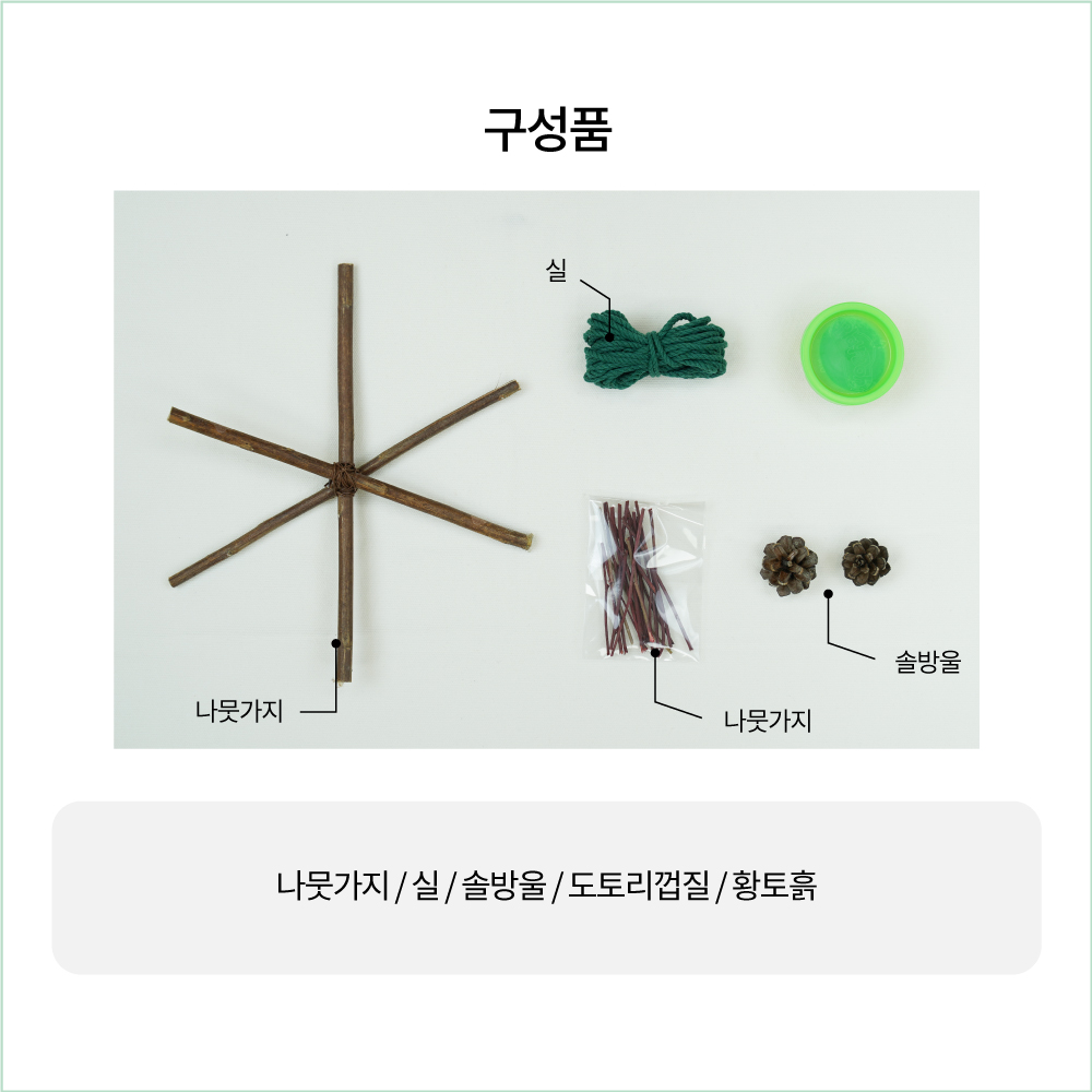 나뭇가지 3개와 예쁜 실, 솔방울, 도토리껍질을